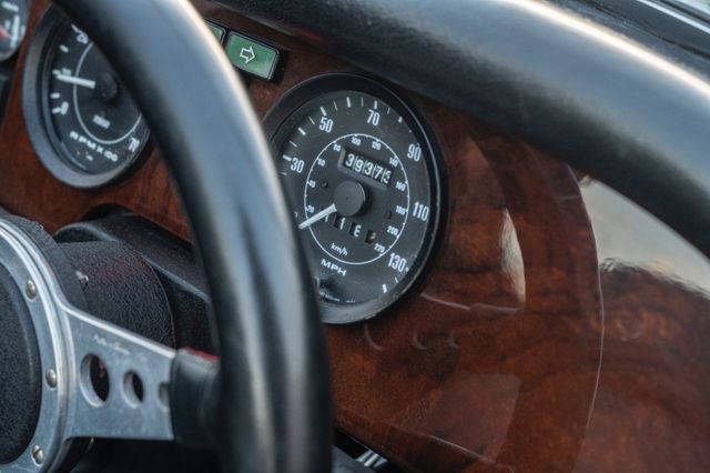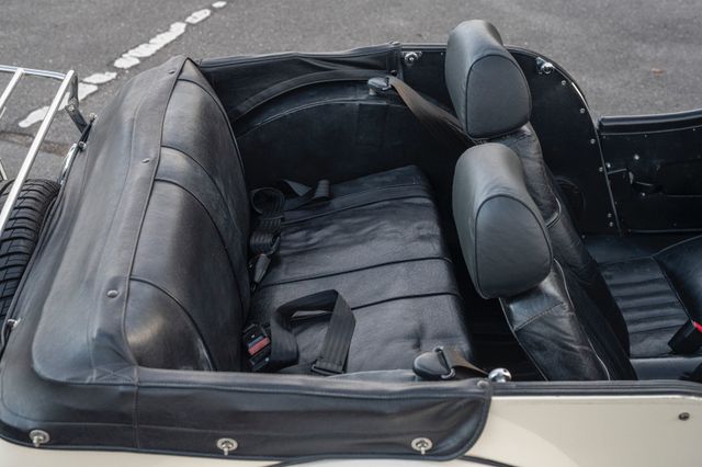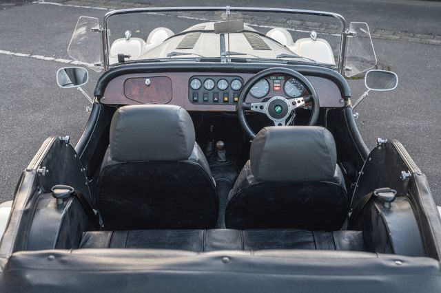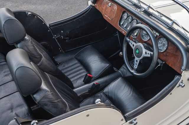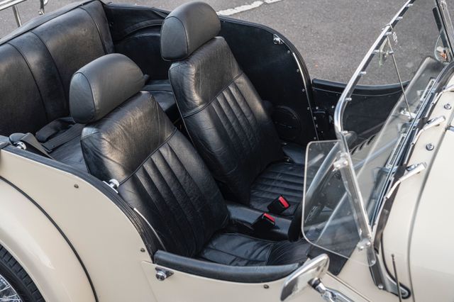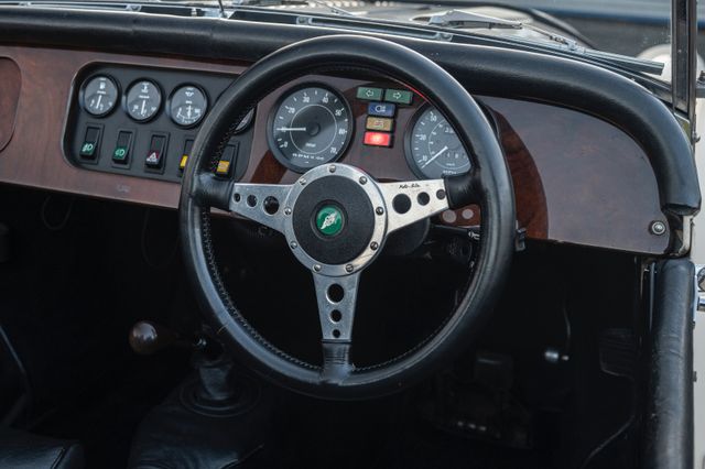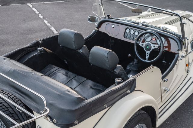 Lackiert ist er in der klassischen Morgan Farbe Royal Ivory, einem sanften Beigeton und steht auf 15" Chromspeichenrädern. Die Front ziert traditionell eine Badgebar mit diversen Abzeichen und Zusatzscheinwerfer mit Edelstahlgehäuse. Am Heck finden sich optional der Gepäckträger und ein Ersatzrad. Das Verdeck besteht aus schwarzem PVC Everflex Kunstleder. Das Interieur ist schwarz gehalten, die Fußräume sind ebenfalls mit schwarzen Teppichen verkleidet. Das Cockpit wird ergänzt durch ein dunkles Holzarmaturenbrett, einem dazu passenden Schaltknauf und einem Moto Lita Lederlenkrad mit polierten Speichen. Der Tacho zeigt eine - dank umfassender Historie - nachvollziehbare Laufleistung von knapp 39.400 an - allerdings in Meilen. Das entspricht gut 64.000 km. Der Morgan 4/4 befindet sich seit 2017 in Deutschland bei demselben Besitzer, der das Fahrzeug aus Großbritanien importiert hat und er wurde seitdem regelmäßig bei André Koopmann in Sulingen gewartet, befindet sich daher technisch in gutem und gepflegtem Zustand. Auch die Historie in der Zeit auf der britischen Insel ist umfangreich dokumentiert.