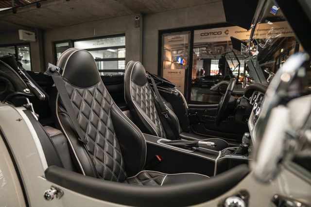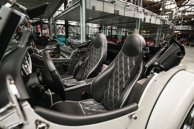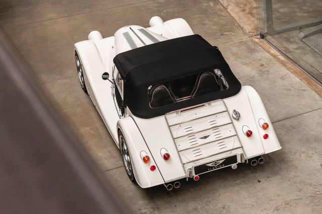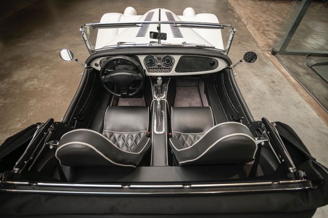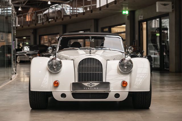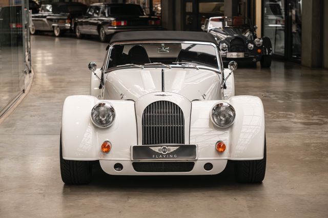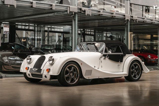 Wir bieten im Kundenauftrag diesen gepflegten Morgan Plus 8 mit dokumentierter Historie an. Der Plus 8 wird angetrieben durch den charismatischen 4.8l V8 von BMW. In diesem Exemplar wurde das ZF 6-Gang Automatikgetriebe als Option gewählt. Lackiert ist das Fahrzeug in Porsche Grandprix Weiß und steht auf 18" Leichtmetallrädern mit poliertem Kranz und Graphitgrau lackiertem Felgenstern. Für kernigen Sound sorgt die Sportabgasanlage von Aero Racing. Für Kontrast sorgt der schwarz lackierte Kühlergrill, sowie das schwarze Mohair Stoffverdeck.