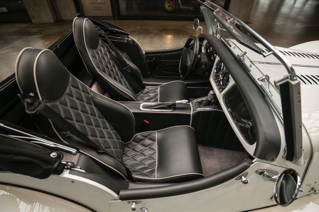 Das Interieur ist bezogen mit Muirhead Leder in anthrazit, welches durch Kontrastnähte und Kontrastkeder in Portland Grey ergänzt wird. Eine Besonderheit sind die gesteppten Sitze - ein Sonderwunsch, der damals in diesem Fahrzeug zum ersten Mal vom Morgan Werk umgesetzt wurde. Für gesteigerten Reisekomfort sorgen ein Tempomat, ein CD-Radio, eine Klimaanlage und praktische Türkartentaschen. Der Morgan Plus 8 wurde seinerzeit über uns bestellt und ausgeliefert.