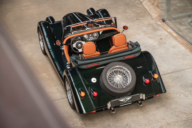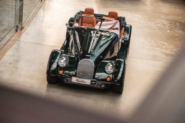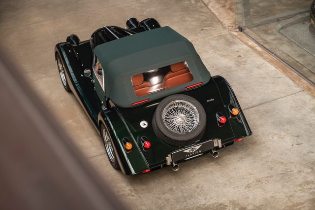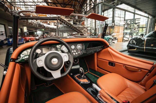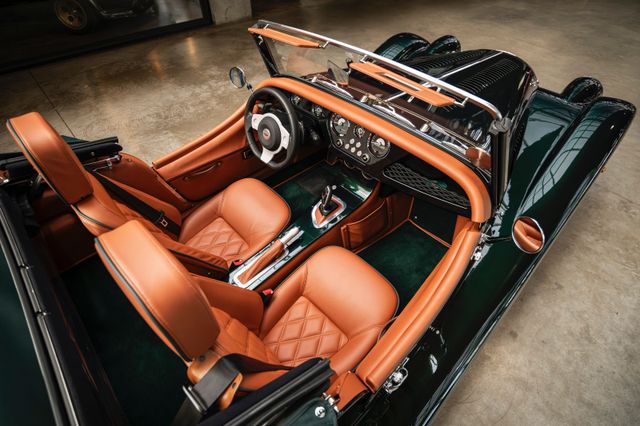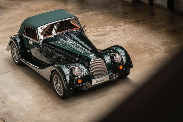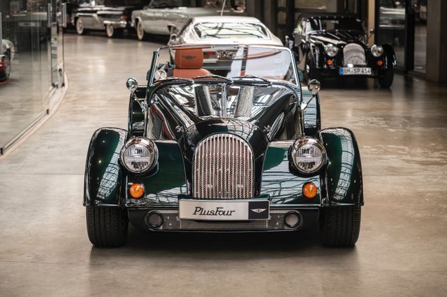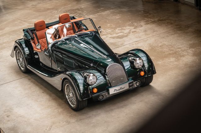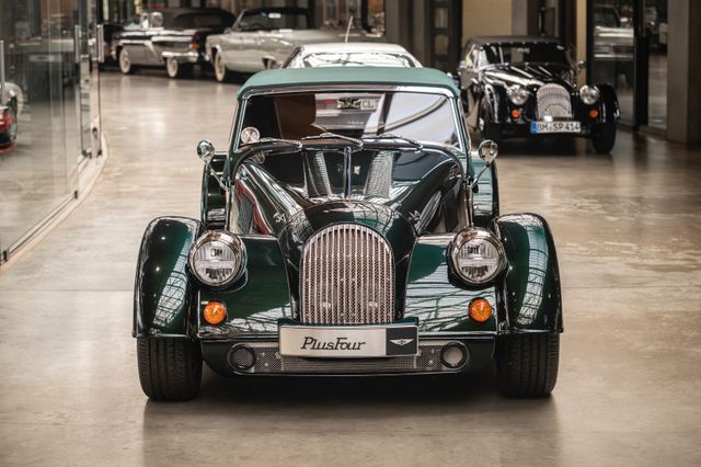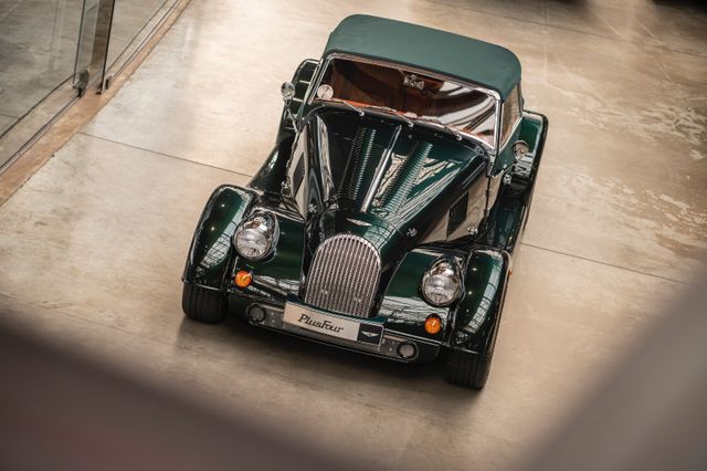Wir bieten im Kundenauftrag diesen Morgan Plus Four mit dem bewährten ZF 8-Gang Automatikgetriebe an - im traditionell brtitischem Gewand. Lackiert ist der Plus Four in Rolls Royce Dark Emerald, einem dunklen Grünton mit aussergewöhnlicher Tiefe. Er steht auf polierten 16" Edelstahlspeichenrädern und besitzt - passend zur Außenfarbe - ein grünes Mohair Stoffverdeck. Für eine kernige Soundkulisse sorgt die Sportabgasanlage mit polierten Blenden.