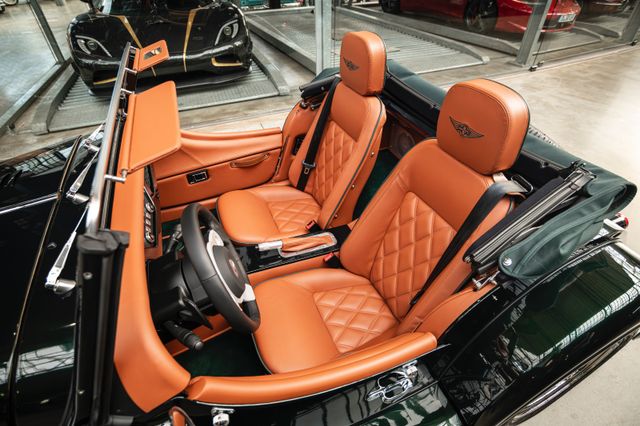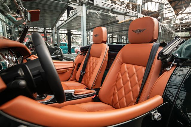 Das Interieur begeistert mit Soft Grain Leder in der Farbe Rich Tan. Das Grün des Äußeren wird ins Cockpit übertragen durch grüne Teppiche, grüne Kontrastkeder, mit grünem Faden bestickte Kopfstützen sowie durch das Armaturenbrett und die Mittelkonsole, die in Wagenfarbe lackiert sind. Die Komfort-Sitze sind rautenförmig gesteppt, die Sitzrücken wurden mit Interieurleder bezogen und verfügen zudem über Sitzheizung. Für noch mehr Reisekomfort sorgen eine Kälteanlage, ein Bluetooth-Audiosystem sowie diepraktische Kartentasche am Getriebetunnel. Zwischen den hinteren Lautsprechern befindet sich zudem noch ein abschließbares Fach.