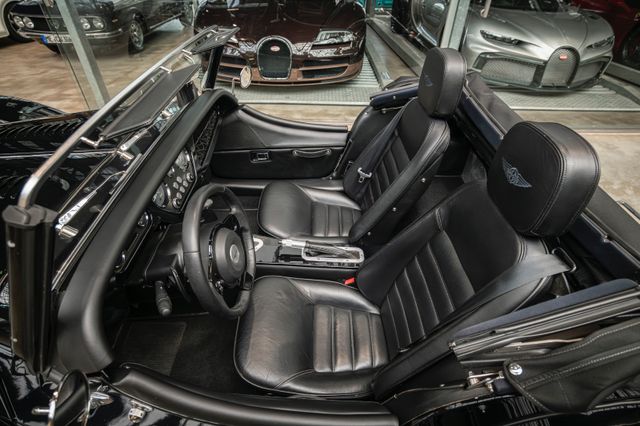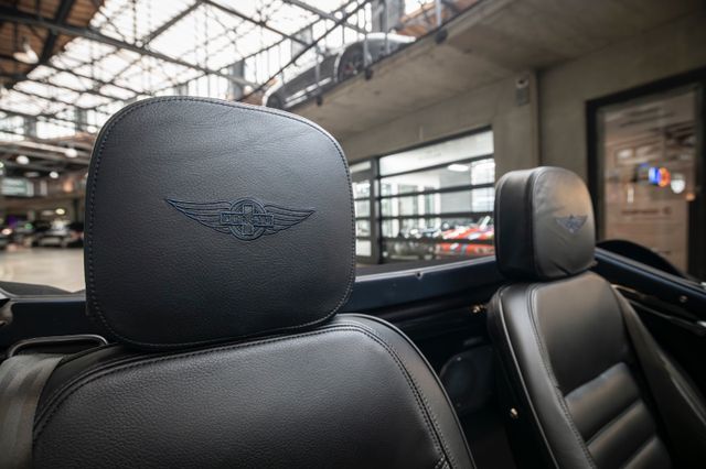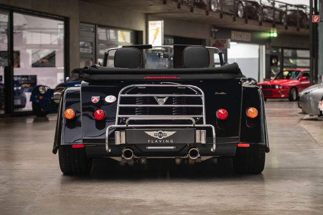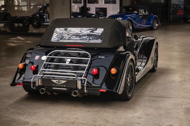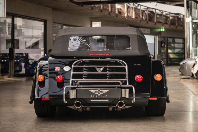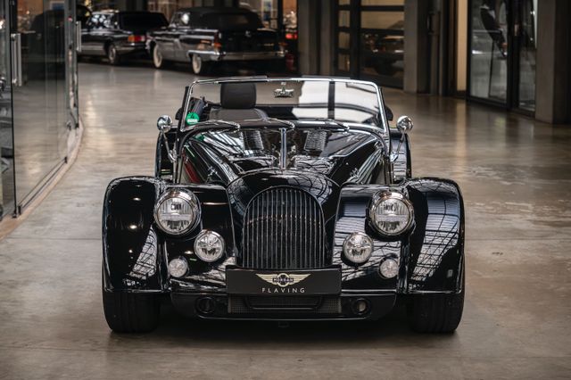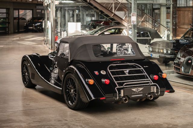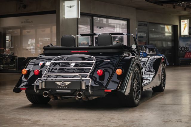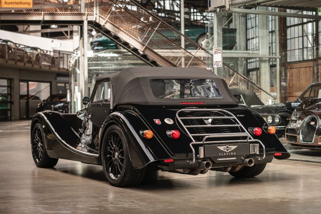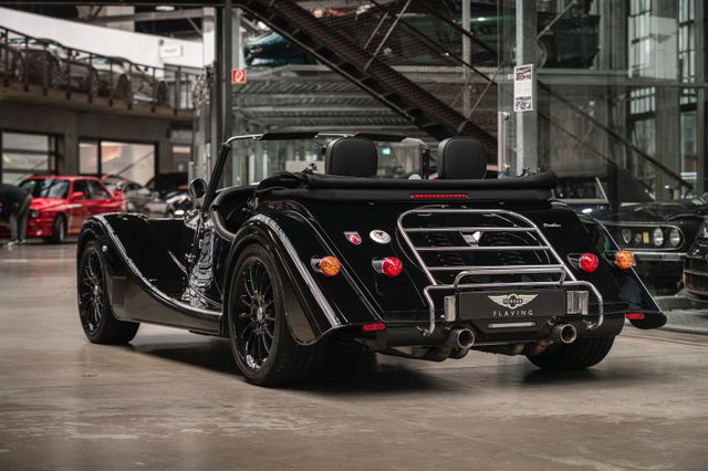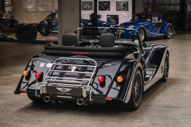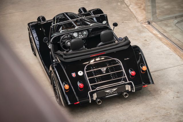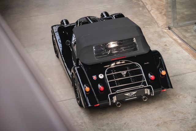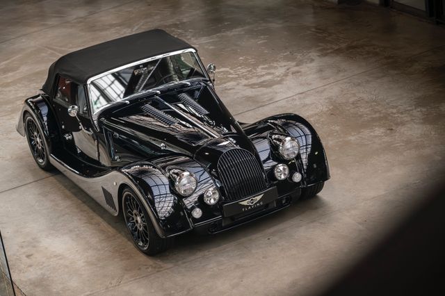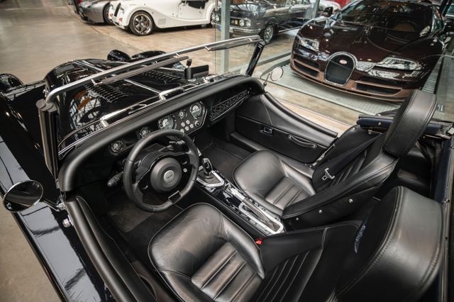 Black is beautiful - Unter diesem Motto steht dieser Morgan Plus Six den wir nun im Kundenauftrag anbeiten. Lackiert ist der Plus Six in der Range Rover Metallic-Farbe Java Black und steht auf schwarz lackierten 19" Leichtmetallrädern. Passend zum homogenen Erscheinungsbild ist vorn auch der Kühlergrill samt Grillgittern schwarz lackiert und das Verdeck besteht aus schwarzem Mohair Stoff. Für kleine Farbtupfer sorgen die weißen Blinker vorn und seitlich, der polierte Edelstahl Gepäckträger sowie die Sportabgasanlage mit polierten Endstücken. Das Interieur ist bezogen mit schwarzem Pebble Grain Leder. Durch den erweiterten Lederumfang sind die Seitenwände des Getriebetunnels und die Einstiege ebenfalls beledert. Das Armaturenbrett und die Mittelkonsole sind in Wagenfarbe lackiert, die Lenkradmittelplatte in hochglanz Schwarz.Die Comfort Plus Sitze weisen eine horizontale Steppung auf, die Kopfstützen sind bestickt mit der berühmten Morgan-Schwinge in schwarzem Faden. Eine Sitzheizung, eine Kälteanlage, ein Bluetooth Soundsystem, zwei USB Anschlüße sowie ein abschließbares Fach hinter den Sitzen sorgen für erhöhten Reisekomfort.Der Morgan Plus Six wurde seinerzeit neu über Morgan Flaving ausgeliefert und regelmäßig gewartet.